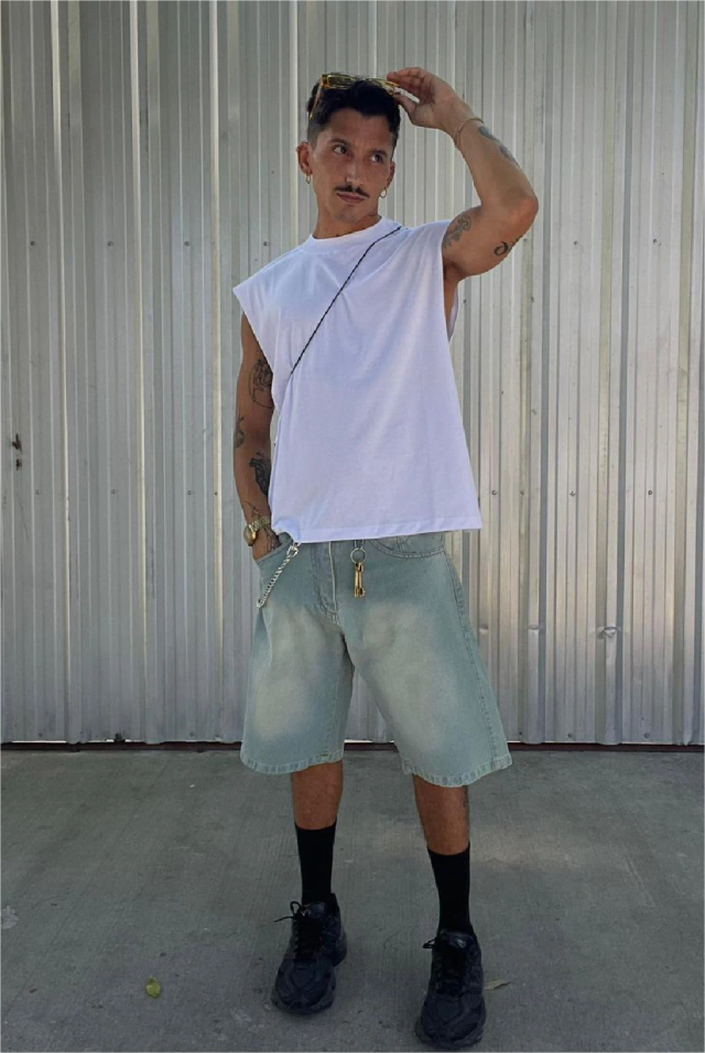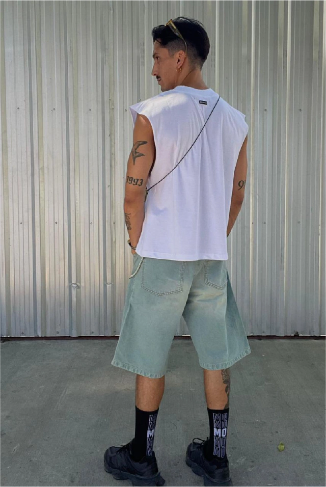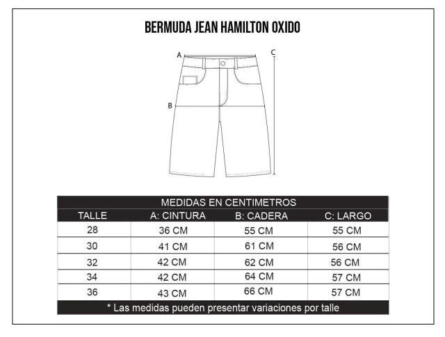 Bermuda de denim rígido, 5 bolsillos.