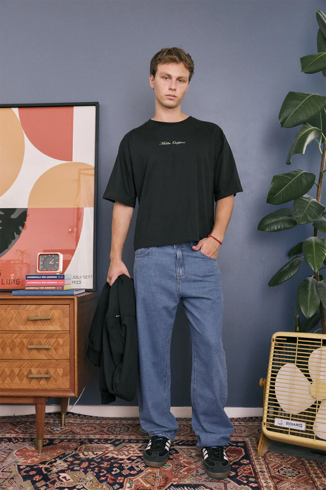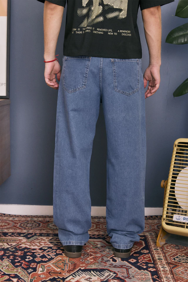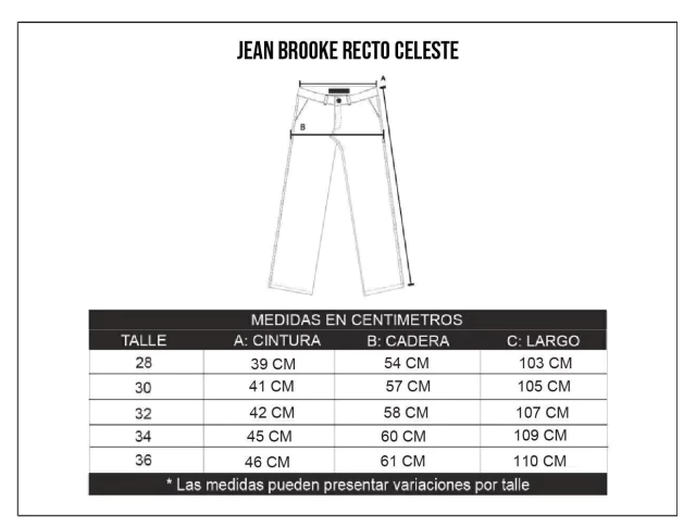 Jean celeste, cuatro bolsillos. Calce recto. Tiro medio.