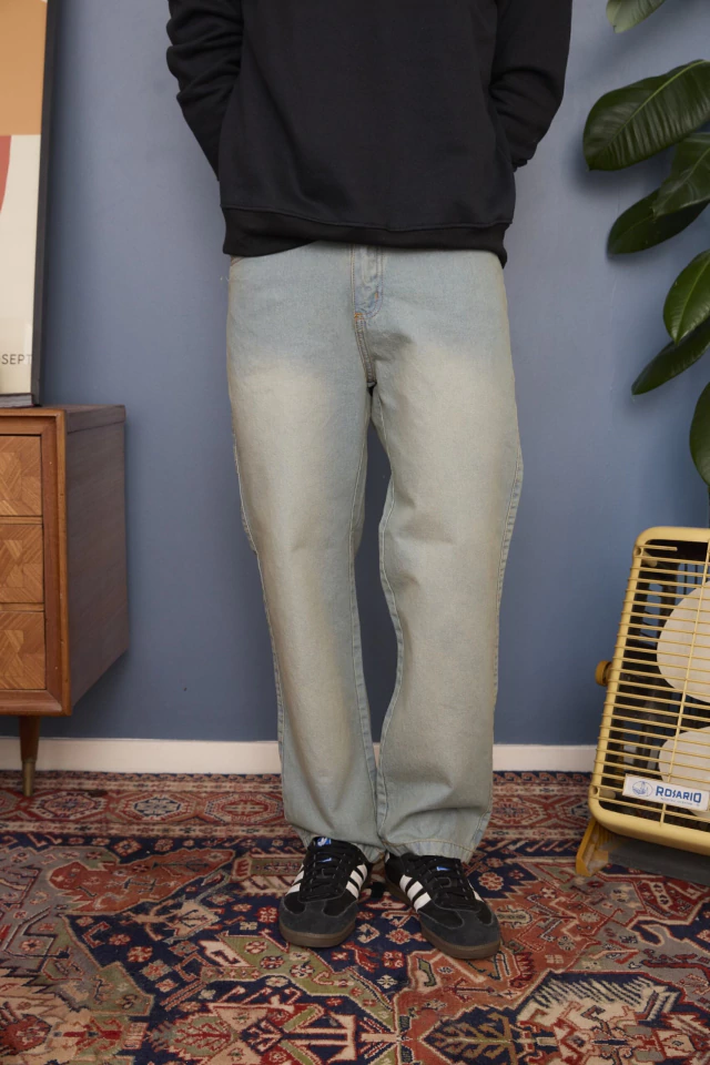 Jean celeste, cuatro bolsillos. Calce recto. Tiro medio.