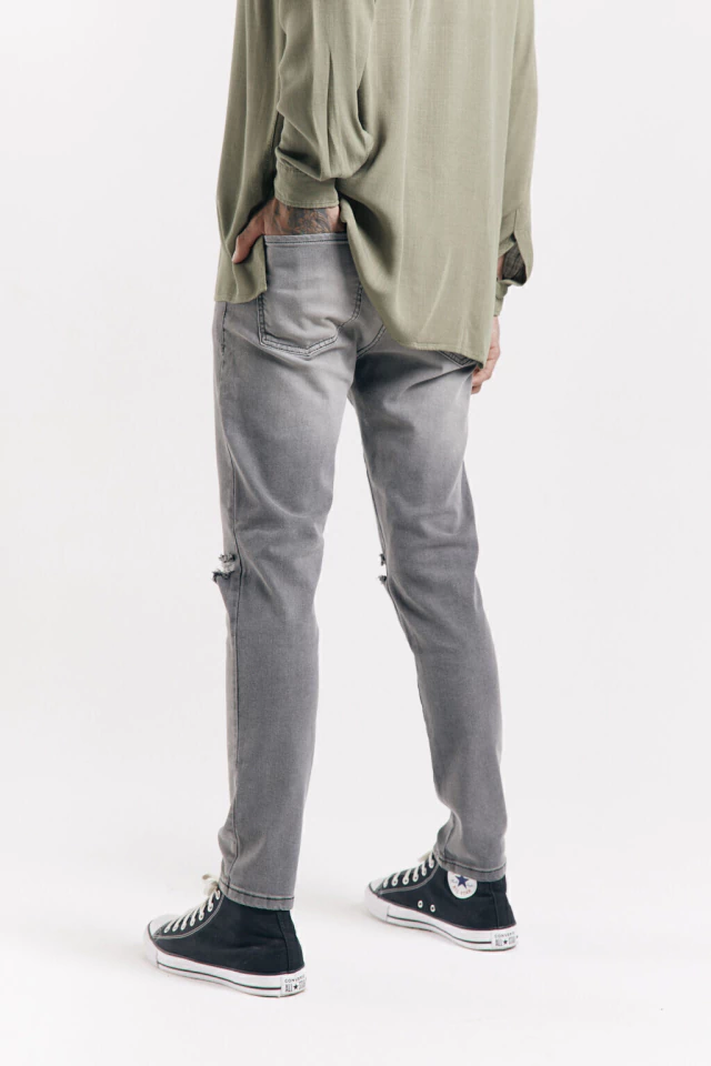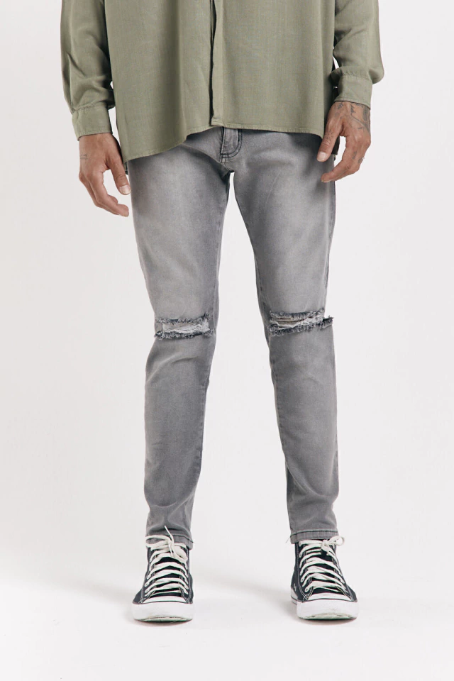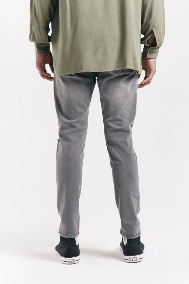 Jean gris, cinco bolsillos. Detalle de localizado en muslos y bigotes delanteros.