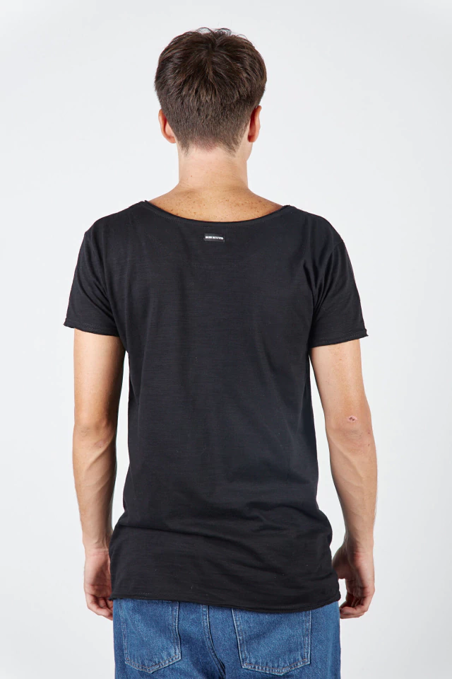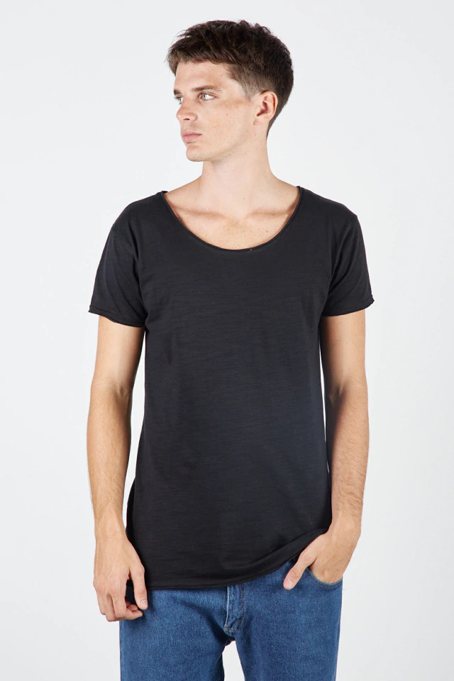 Remera manga corta de jersey flamé. Con cuello amplio y calce al cuerpo.